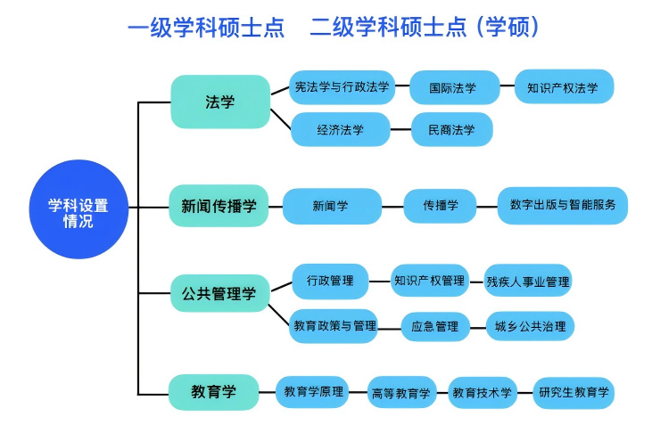 学院现有法学、广告学、网络与新媒体、社会工作、汉语国际教育5个本科专业,1个法学(知识产权)本科辅修专业。法学为国家一流本科专业建设点,新闻传播学、教育学为湖北省重点学科,法学、新闻传播学入选湖北省普通本科高校“荆楚卓越人才”协同育人计划。学院现有法学、教育学、新闻传播学、公共管理学4个一级学科硕士点,设有宪法学与行政法学、民商法学、经济法学、知识产权法学、国际法学、新闻学、传播学、数字出版与智能服务、教育学原理、高等教育学、教育技术学、研究生教育学、教育政策与管理、行政管理、知识产权管理、残疾人事业管理、应急管理和城乡公共治理18个二级学位硕士点,设有法律、新闻与传播、公共管理(MPA)、社会工作、国际中文教育和出版6个专业学位硕士点,共享共建马克思主义理论博士后流动站,同时招收思想政治教育、科技与教育管理、知识产权与产业高质量发展等方向的博士。现有在校学生2296人,其中硕博研究生744人,本科生1432人,预科生120人。