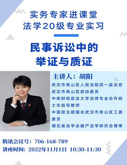 2022年11月1日10点半,法学系本科2020级在腾讯会议上举行实务专家进课堂,法学2020级专业实习讲座:民事诉讼中的举证与质证。特邀请胡阳法官主讲。胡阳,武汉市青山区人民法院民一庭法官,武汉市青山区政协委员,中南财经政法大学法律专业合作硕士生指导教师,中国民主建国会武汉市青山区工委委,湖北省法学会破产法学研究会理事。在前期的充分准备下,法学系本科2020级的同学们提前进入腾讯会议,在高效的组织下有序完成签到,认真聆听,积极提问。
