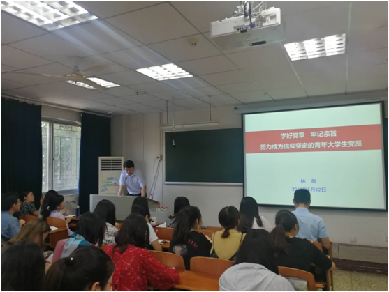 开班典礼上,由法学社会学院党委副书记林凯对大家做了开班动员,动员结束后本次党校培训的理论学习正式开始。本次理论学习的第一讲由林书记主讲,他以“学好党章,牢记宗旨,努力成为信仰坚定的青年大学生共产党员”为主题,围绕中国共产党的党章、宗旨以及我们青年大学生所面临的挑战三个角度进行了深入浅出的讲解。他说道,青年大学生党员应当自觉学习、遵守、维护、贯彻党章,明确并在实践中贯彻中国共产党“全心全意为人民服务”的宗旨,在面对挑战时要敢于直面、勇于担当、坚定信仰。我们青年大学生党员是实现中华民族伟大复兴中国梦的青春力量,应当做到坚持一个导向,做好两个统一,培养三种能力,即牢牢坚持为人民服务的导向,做好“仰望星空”与“脚踏实地”的统一,培养明辨是非、求真务实、创新进取的能力。