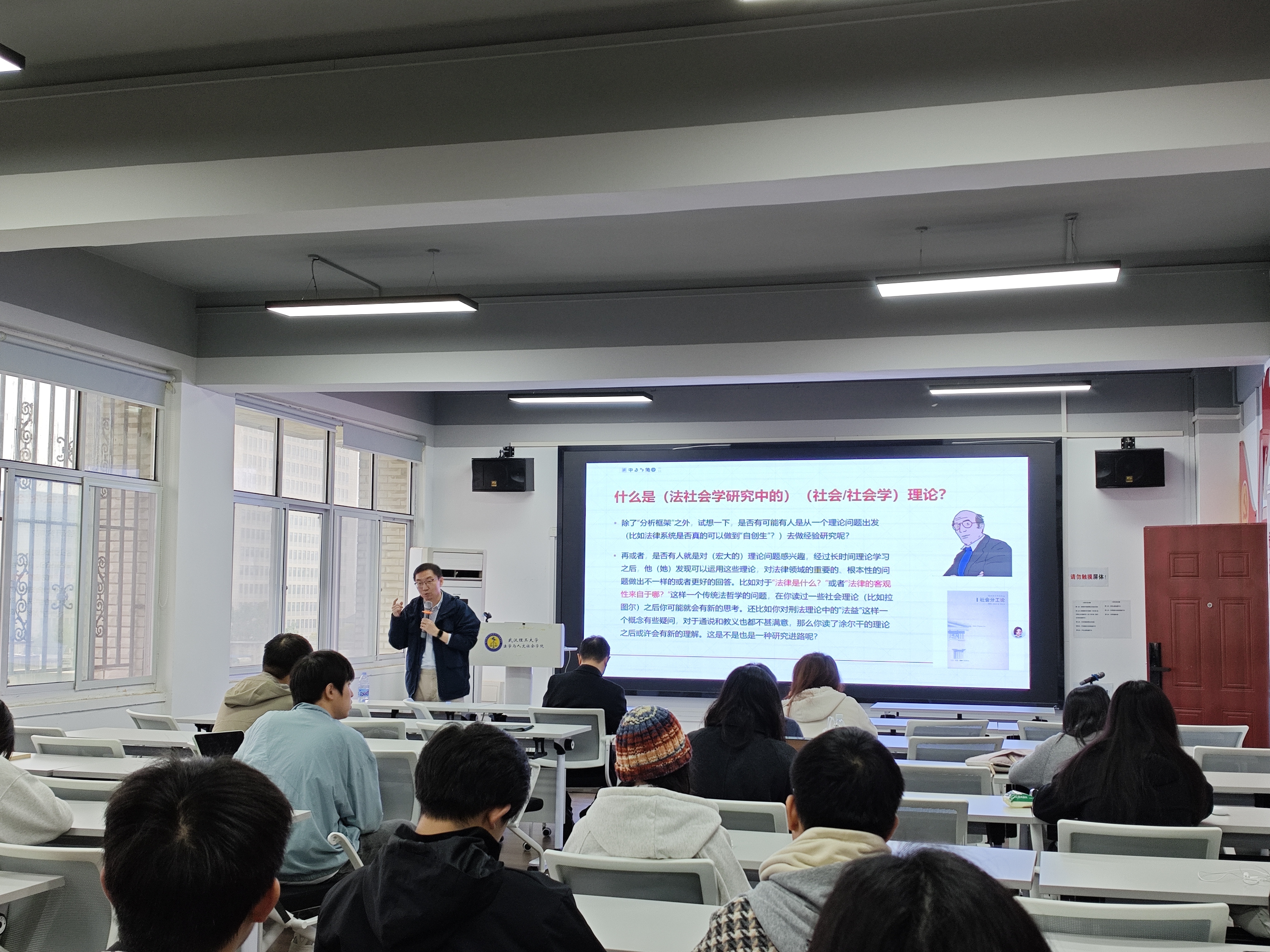 讲座中,杨帆教授以学界社科法学与法教义学之争为引,围绕法学研究的社会理论路径展开分享,介绍了自然法、实证主义、社会法理论三大法学研究支柱。他深入阐释法社会学研究中理论的作用,对比了欧洲与美国两种研究路径的差异,解读了欧洲式“大理论”对法学研究的独特价值。杨帆教授还指出,将社会理论纳入法社会学研究十分必要,能够丰富法社会学研究范式、打破学科壁垒,让其成为法学研究的第三条重要路径。最后,他还通过解析法律商谈理论、行动者网络理论等实例,详解了社会理论作用于法律领域的具体路径,为研究提供了全新视角。