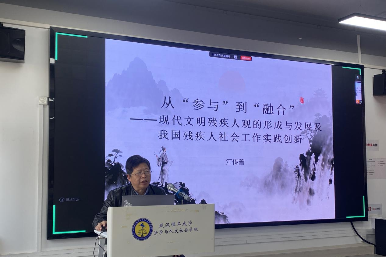 11月14日下午,法社学院第三十三期卓越名家论坛在弘毅楼915报告厅成功举行。湖北省人民政府残疾人工作委员会办公室常务副主任江传曾受邀,为漫画18 师生作了题为“从‘参与’到‘融合’——现代文明残疾人观的形成与发展及我国残疾人社会工作实践创新”的专题讲座。讲座由社会学系秦琴教授主持,学院50余名师生参加。