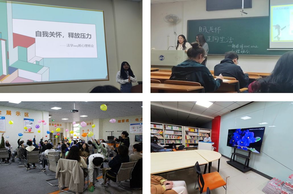 与以往有所创新的是,学院心理健康教育活动月还设置了“心理课堂进班级”活动。学院全部班级围绕“自我关怀,正向生活”主题,根据班级自身情况举办了心理班会。这保障了“心理健康教育活动月”系列活动可以覆盖所有人,使得性格内向的同学们也可以有机会了解到心理知识,帮助他们更好地接纳自我、培养信心,从而在学院营造良好的心理健康氛围。