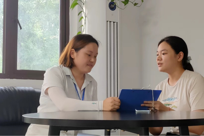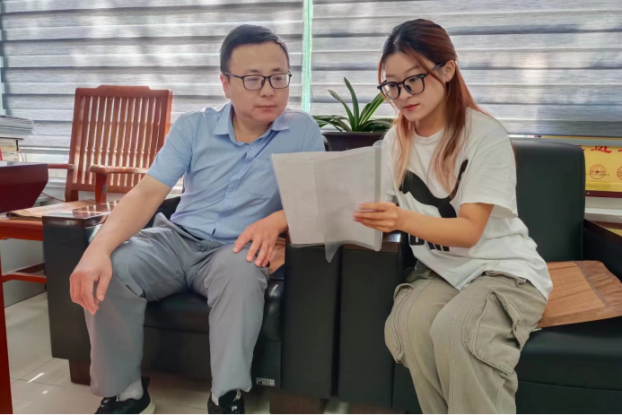 (图2-实践队成员刘文淼与山东省济南市莱芜区教育和体育局工作人员探讨)