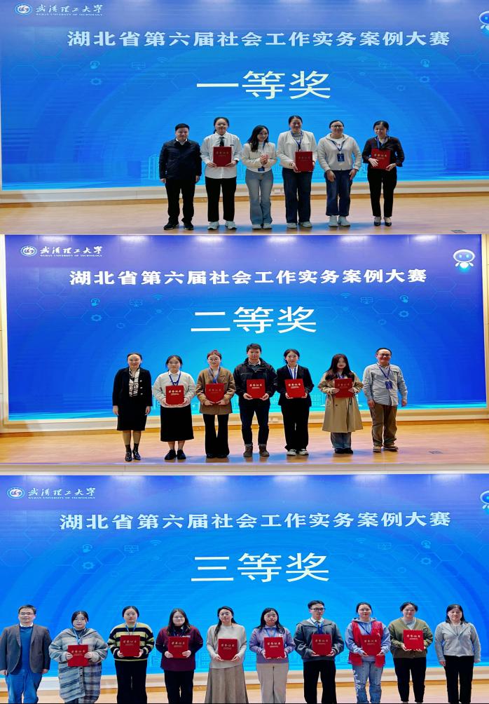 经过激烈角逐,最终评选出高校组和机构组各奖项。高校组中,我校“大学生就业行动力共创成长干预”代表队荣获一等奖,中南民族大学、华中农业大学代表队获得二等奖,华中师范大学、湖北文理学院、华中科技大学代表队获得三等奖。机构组中,武汉市武昌区华仁社会工作服务中心、武汉市阳光社会工作服务中心荣获一等奖,湖北省荆楚社会工作服务中心、湖北省肿瘤医院、武汉市东湖高新区左岭街道长岭社区获得二等奖,武汉清晨创新社会工作服务中心、武汉东湖新技术开发区达观社会创新发展中心、京山市金阳光社会工作服务中心、武汉市东西湖区汉德社会工作服务中心、江汉区友谊青少年空间社会工作服务中心获得三等奖。其余队伍获得优秀奖。颁奖典礼上,领导嘉宾为获奖队伍颁奖并合影留念。