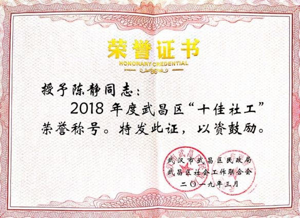 (图4-陈静获得武昌区“十佳社工”荣誉称号)