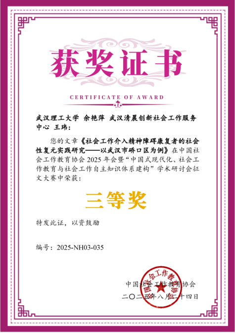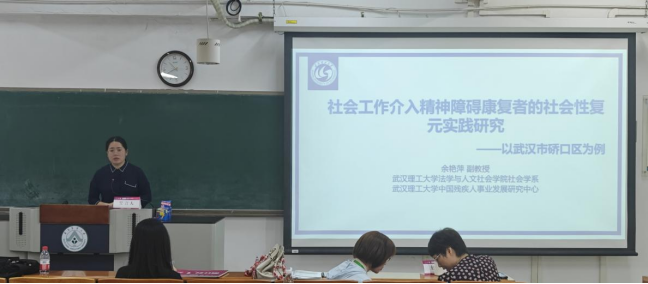 社会学系余艳萍副教授担任了学术研讨会分论坛七第一阶段的主持人,并在第二阶段做了题为“社会工作介入精神障碍康复者的社会性复元实践研究——以武汉市硚口区为例”的报告,指出精神障碍康复者的介入实践转向应从“个体康复”转向“社会联结”,通过社区参与、角色赋予等路径促进康复者与社会的动态互动,实现社会性复元。该论文获得大会论文三等奖。