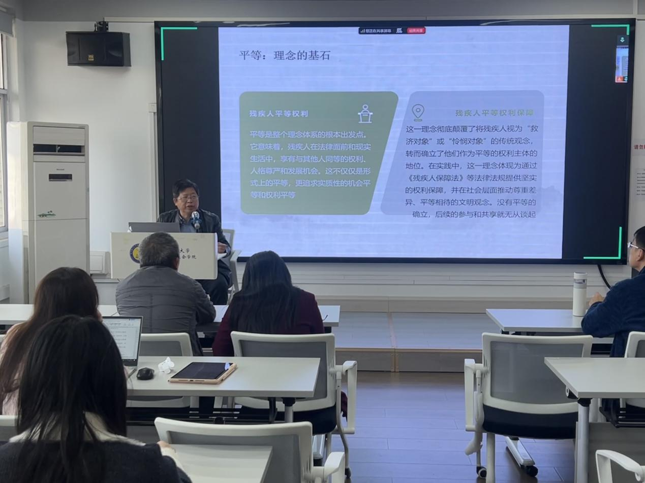 讲座中,江主任围绕核心内容进行深入阐释。他首先梳理了从“平等、参与、共享”到“平等、融合、共享”的理念演进历程,并指出“融合”相较于“参与”,更强调社会系统的系统性变革,要求消除物理、沟通与观念障碍,实现残疾人与社会的深度一体化。随后,他回顾了残疾人观念从医疗慈善模式向社会权利模式的转变,详解了现代残疾人观的核心内涵与形成动因,强调残疾人作为平等权利主体,是推进中国式现代化的重要力量。