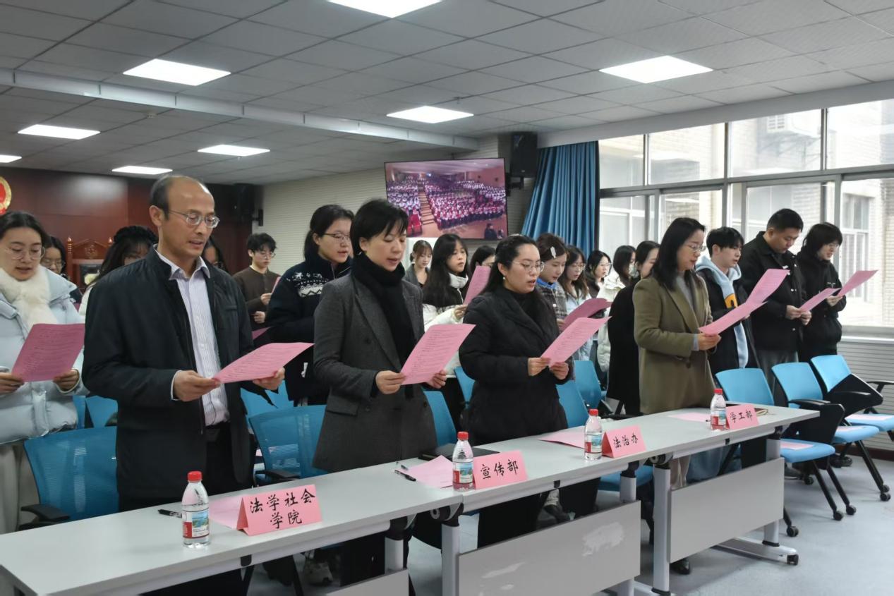 为深入贯彻党的二十大和二十届三中、四中全会精神,全面落实习近平法治思想,贯彻落实《教育强国建设规划纲要(2024—2035年)》,加强对青少年学生的宪法法治教育,普及宪法法治知识,培育宪法法治观念,弘扬宪法法治精神,12月4日上午,学院于马房山校区东院弘毅楼912智慧模拟法庭隆重举办了第十二个国家宪法日教育系统“宪法晨读”活动。法学社会学院党委书记耿英刚、党委宣传部副部长谭立满、依法治校办公室主任汪茜、党委学生工作部教育办公室主任敬晓慧出席活动,学工办全体辅导员共同参与了此次活动。